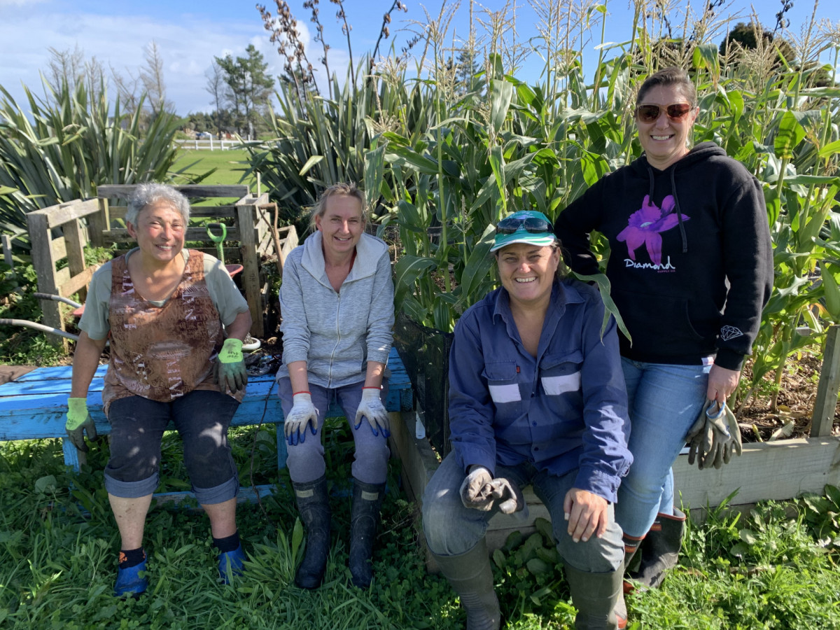 Pictured above, from left, Erna Okano, Rachel Martin, Elizabeth Minato and Richelle Schaper, the Tū Pono Connector for Te Hā o Kawatiri, at Te Hā’s community māra kai.